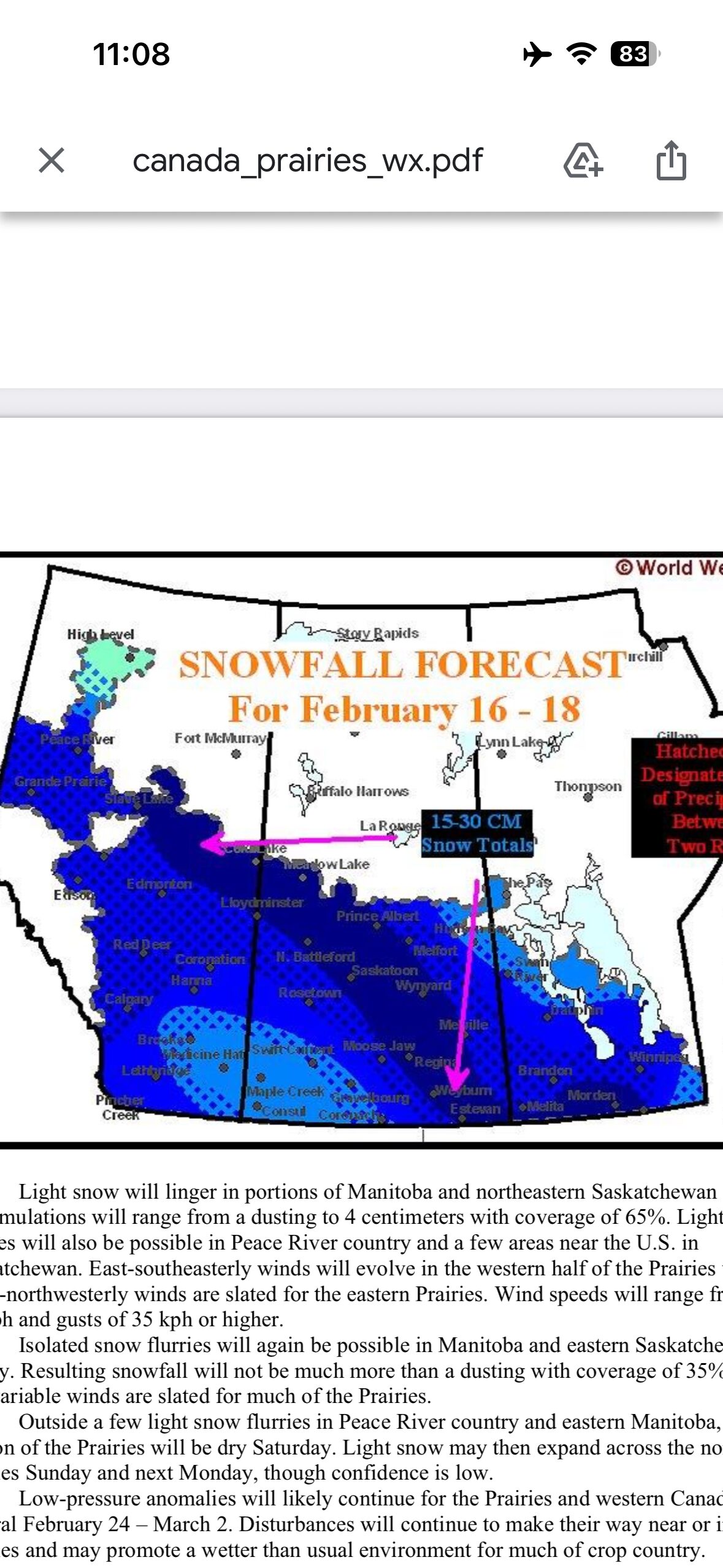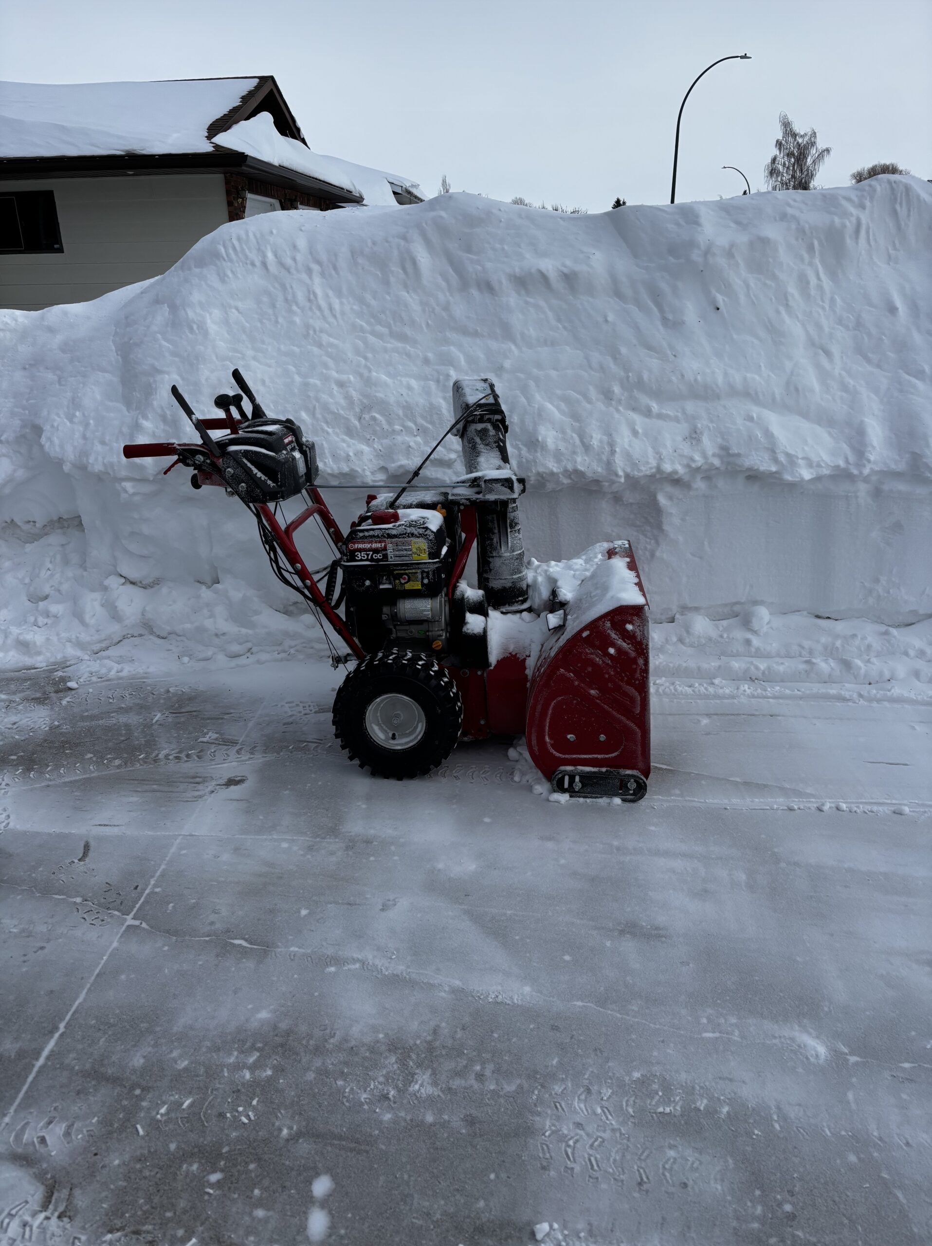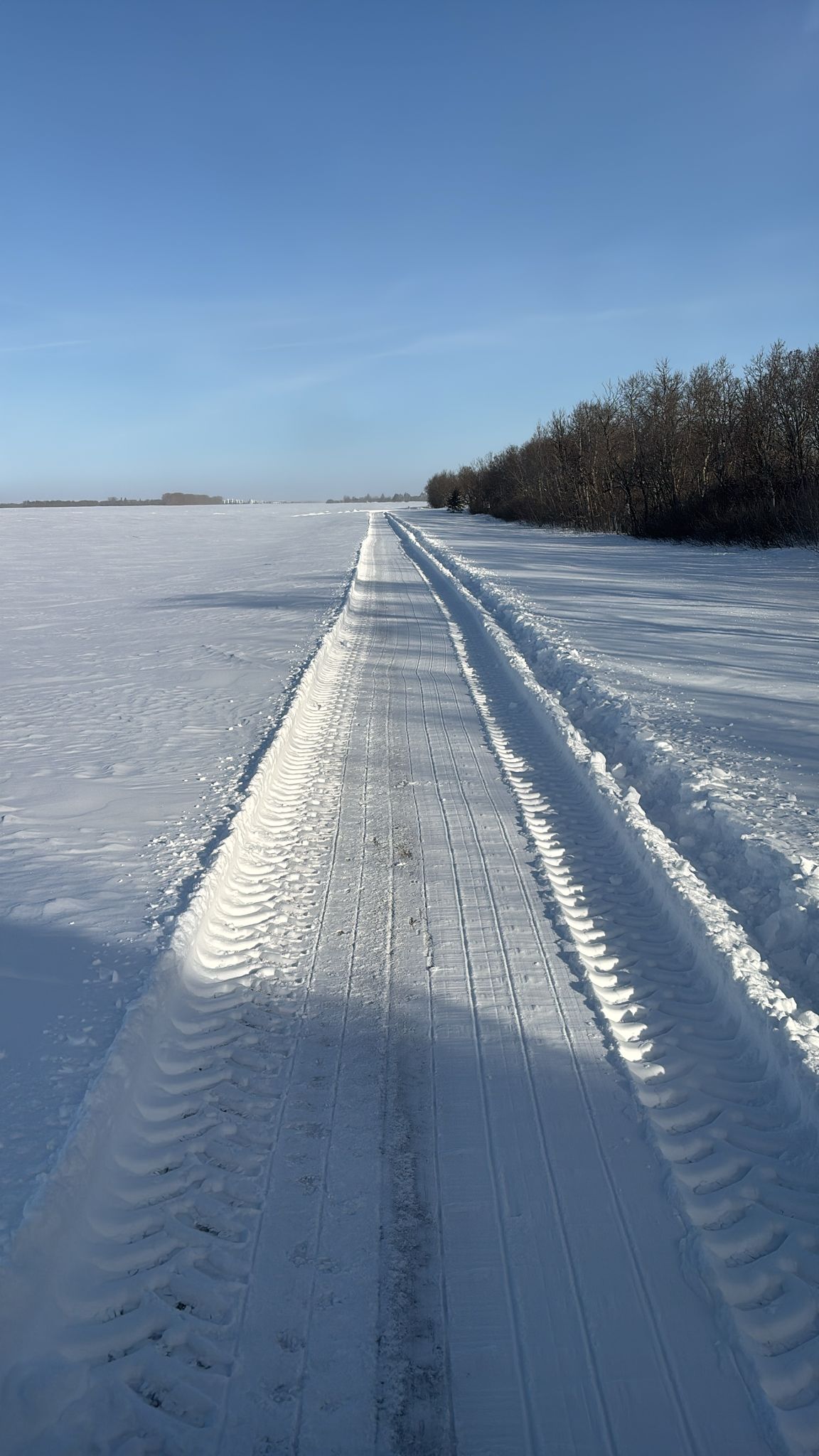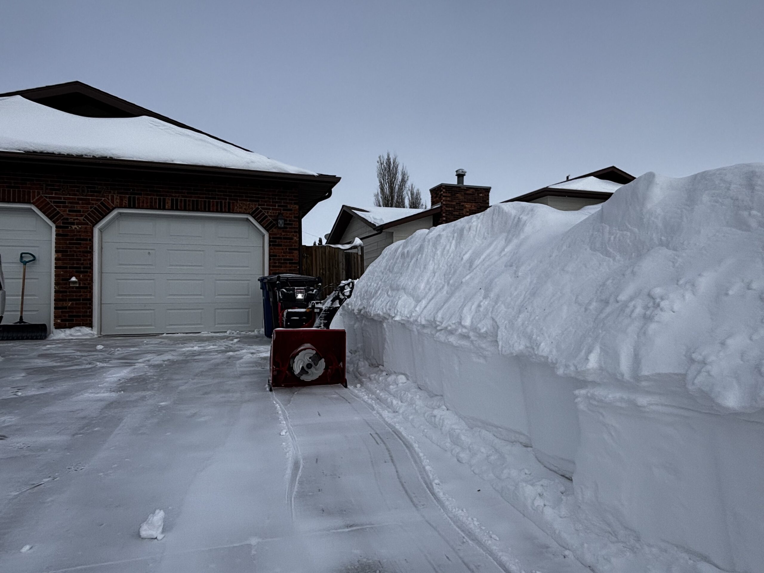 At the start of February snow had been melting due to the warm spells that we have been having – in fact you could start to see stubble in the fields, and the odd spot where there wasn’t much stubble you could start to see bare ground. Starting mid February until the end of the month we had two successive storms that brought another 2’ of snow. The first event was the bigger storm – it dropped 18” along with 50-70km winds. The second storm less than a week later dropped another 6” of snow. That has kept us busy pushing snow – and with all that loose snow anytime the wind picks up again, it blows causing drifts that need to be cleaned up again.